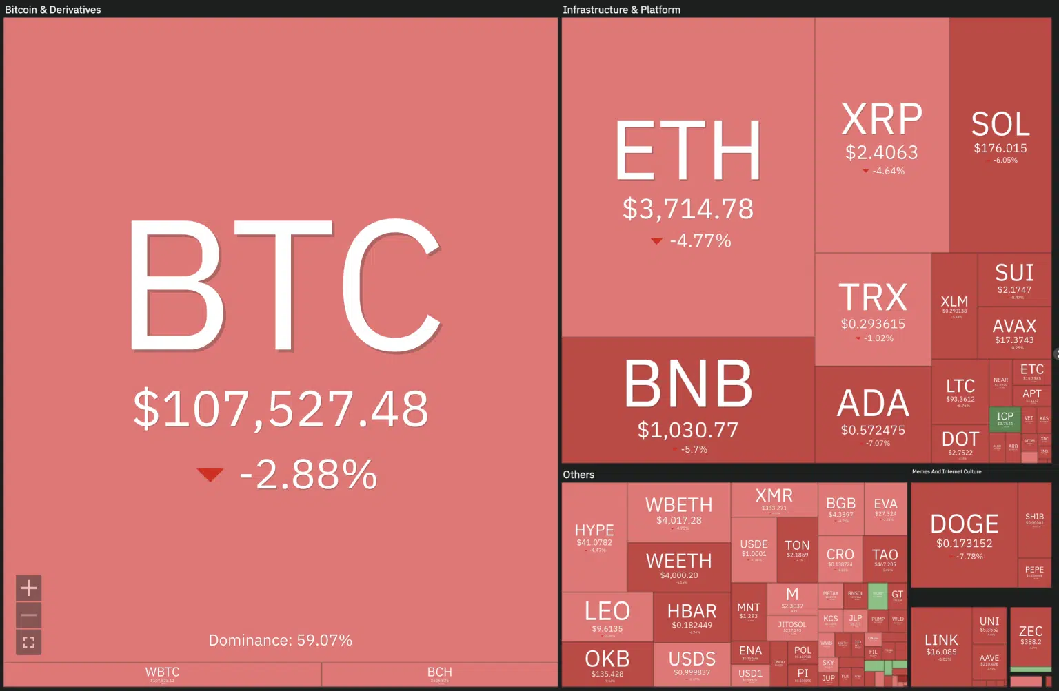 در مجموع، ارزش بازار رمزارزها با ۳.۶۴٪ کاهش به حدود ۳.۵۹ تریلیون دلار رسید.